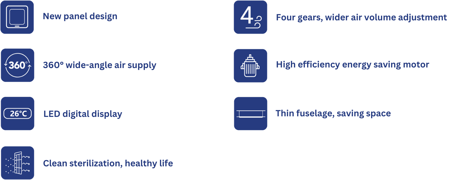 Through the new DC inverter fan motor, achieve 2100m3/h air outlet volume, and improve the air. Exchange efficiency by 30%.