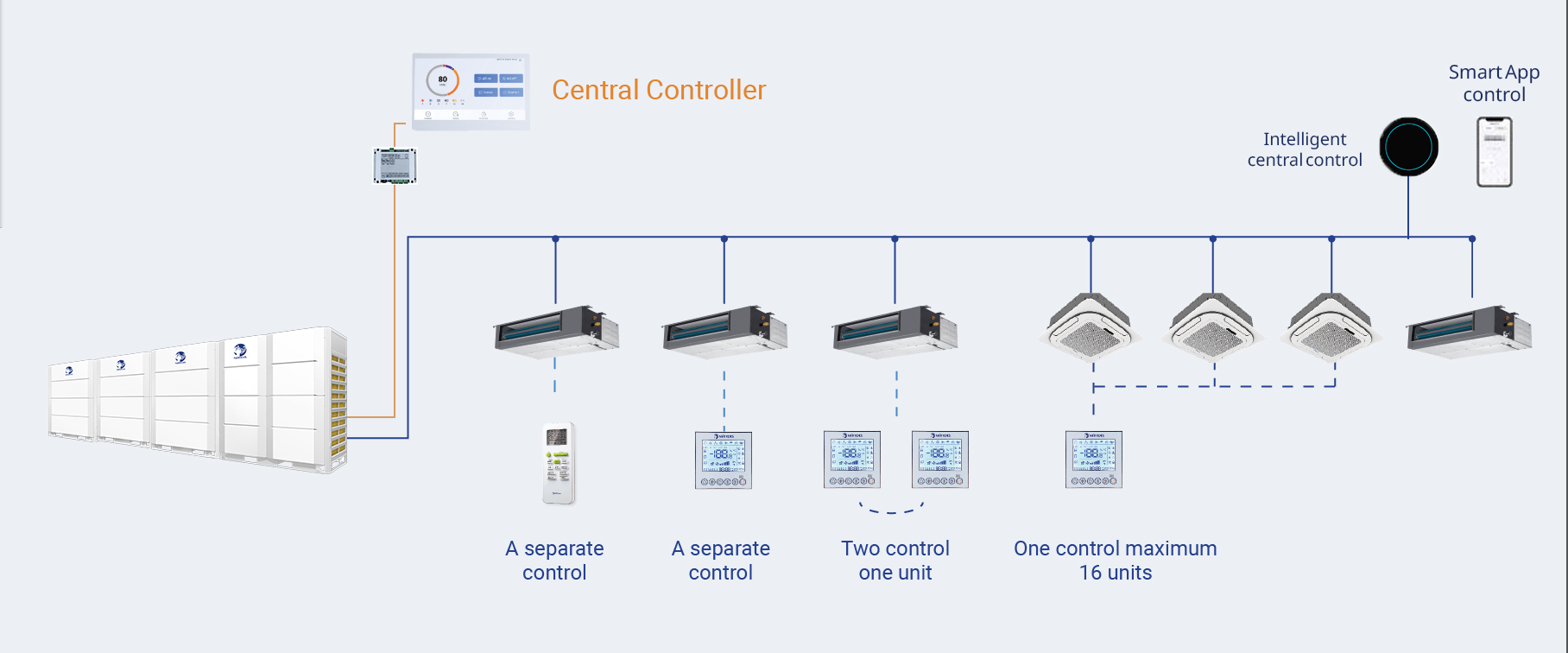 • Up to 16 systems and 1280 indoor units can be connected, easy to set indoor units parameters.