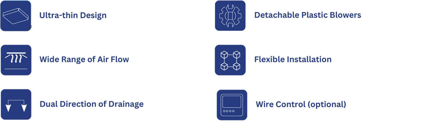 This NØRDIS VRF Ceiling and Floor indoor unit features an ultra-thin design suitable for various interior styles, a wide 0°–110° air supply angle that ensures more even and comfortable room temperature, dual-side condensate drainage from either the left or right, easily detachable plastic blowers for convenient maintenance, and flexible installation options allowing it to be mounted either on the ceiling or standing on the floor. It also comes with a remote controller for easy operation.